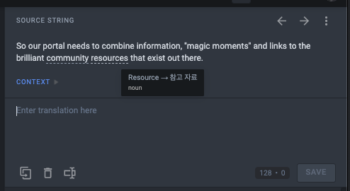 - First, when you find an underlined term on the source string, you can mouse over and see a brief definition of it.