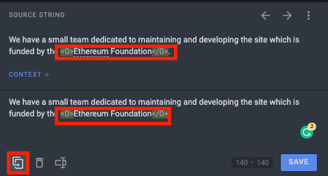 must not be translated or removed. - To keep the string safe, we recommend that you click the "Copy Source" button on the bottom left. This will copy the original string and paste it into the text box. This lets you clarify where the tags are and helps you avoid mistakes.